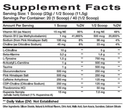 Instruktioner: Indtag 1 rund scoop blandet med 16-18 oz vand på tom mave cirka 15-30 minutter før træning. Brugere kan begynde med 1/2 scoop for at vurdere tolerance