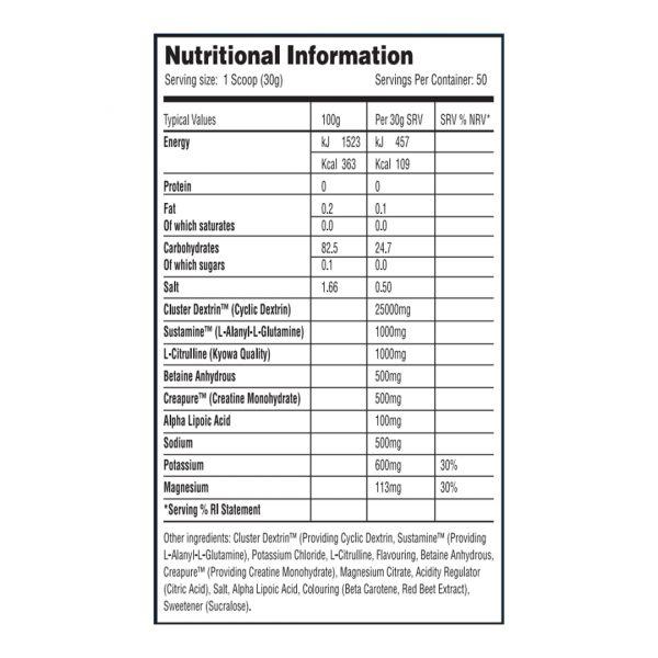 Tri-Carb Blend (25g pr. portion): Vores tri-carb blanding består af Bygmel (10g), Cyclic Dextrin (10g) og Fruktose (5g), som giver en afbalanceret og effektiv kilde til kulhydrater. Denne kombination er designet til at optimere optagelsen af kulhydrater, hvilket sikrer en vedvarende energifrigivelse uden spidser og nedture.