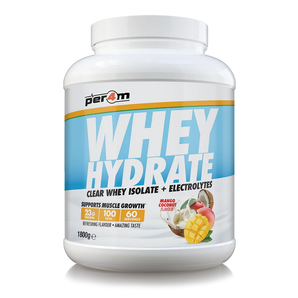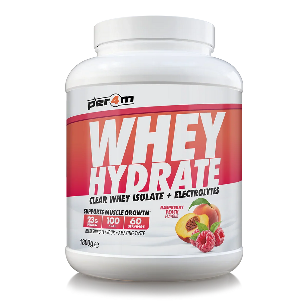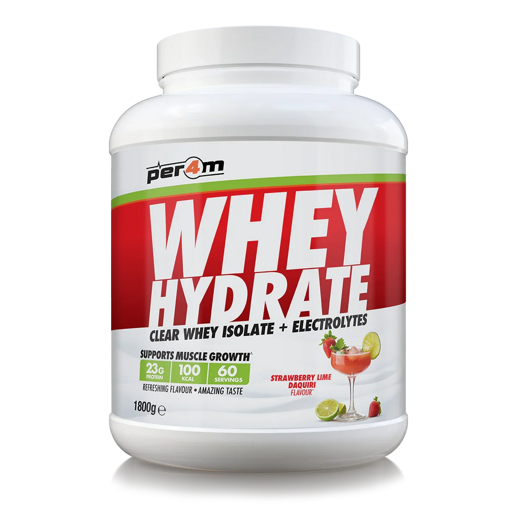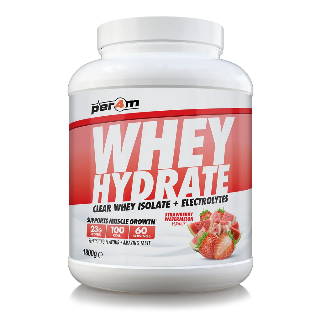 Per4m Whey Hydrate – en forfriskende proteinrig drik, der understøtter både restitution og hydrering i én ren, let shake. Den leverer 23 g ultrafiltreret, klar valleisolat med tilsatte elektrolytter og vitaminer – designet til at hjælpe din krop med at reparere, genopfylde og rehydrere uden den mælkeagtige smag eller tekstur, der kendetegner en traditionel proteinshake.