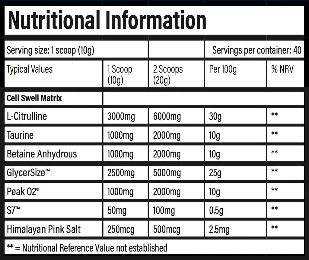 Cell Swell Matrix: Vores eksklusive blanding af fritstående Citrullin, Taurin og Betain forbereder dine muskler til vækst og udholdenhed, hvilket gør hver gentagelse betydningsfuld.